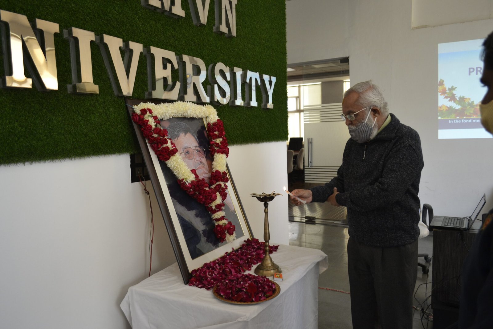 पलवल (आवाज केसरी) एम वी एन विश्वविद्यालय में एम वी एन सोसाइटी के संस्थापक स्वर्गीय श्री गोपाल शर्मा की 16वीं पुण्य तिथि पर प्रार्थना सभा व खेलकूद प्रतियोगिता का आयोजन किया गया। विश्वविद्यालय की प्रबंधक संचालक कांता शर्मा, अध्यक्ष वरुण शर्मा, कुलाधिपति संतोष शर्मा,कुलपति प्रो (डॉ) जे.वी देसाई, कुलसचिव डॉ राजीव रतन, विभिन्न संकायो के विभागाध्यक्ष, शिक्षक गण व गैर शिक्षक गणों ने पुष्पांजलि अर्पित कर उन्हें भावभीनी श्रद्धांजलि दी और सभी ने 2 मिनट का मौन रखकर उनकी आत्मा की शांति के लिए प्रार्थना की।